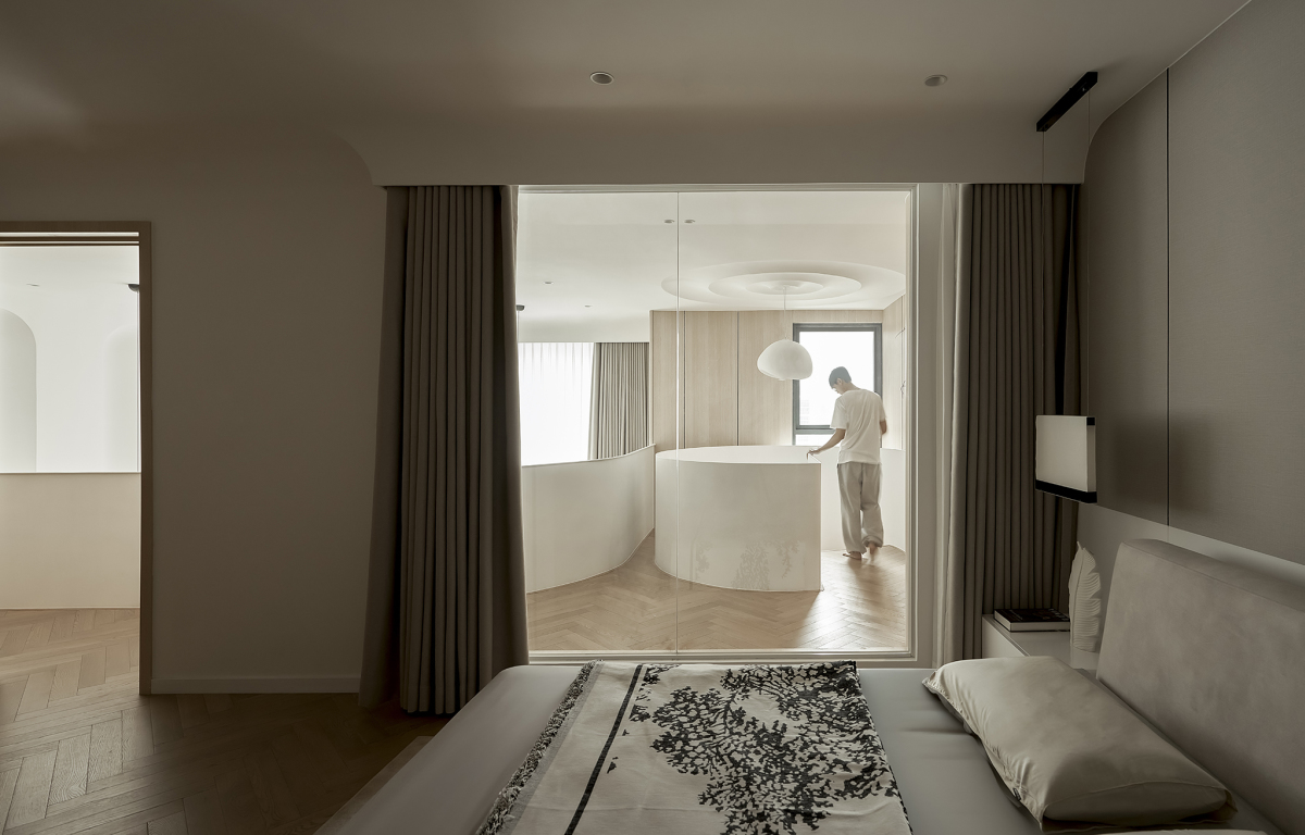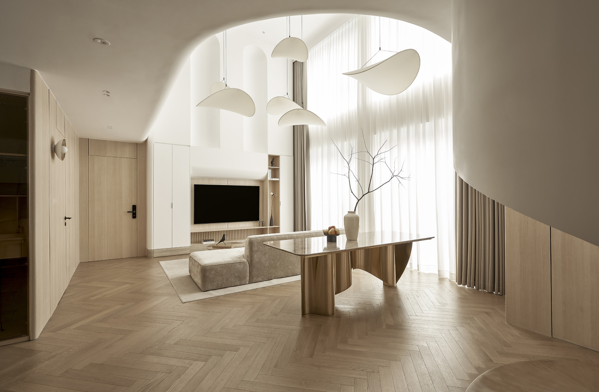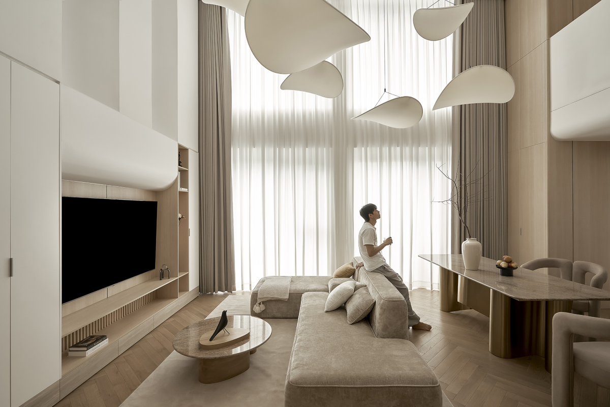 Công trình được bàn giao thô, với một sàn trống, trần cao 5,9 m. Sau khảo sát và theo nhu cầu của gia chủ, nhóm KTS chọn phương án thiết kế thêm hệ sàn lửng để tăng diện tích sử dụng lên 180 m2. Căn hộ sau thiết kế lại có 3 phòng ngủ, 3 vệ sinh và một không gian sinh hoạt chung rộng rãi.