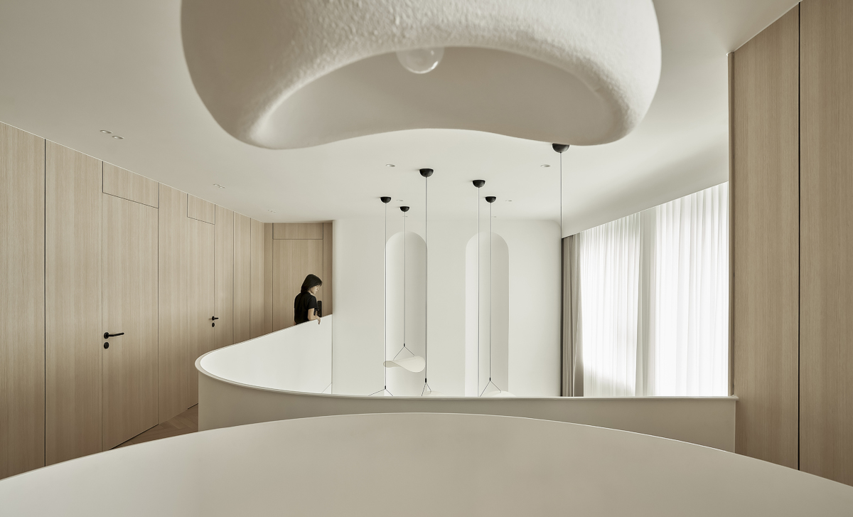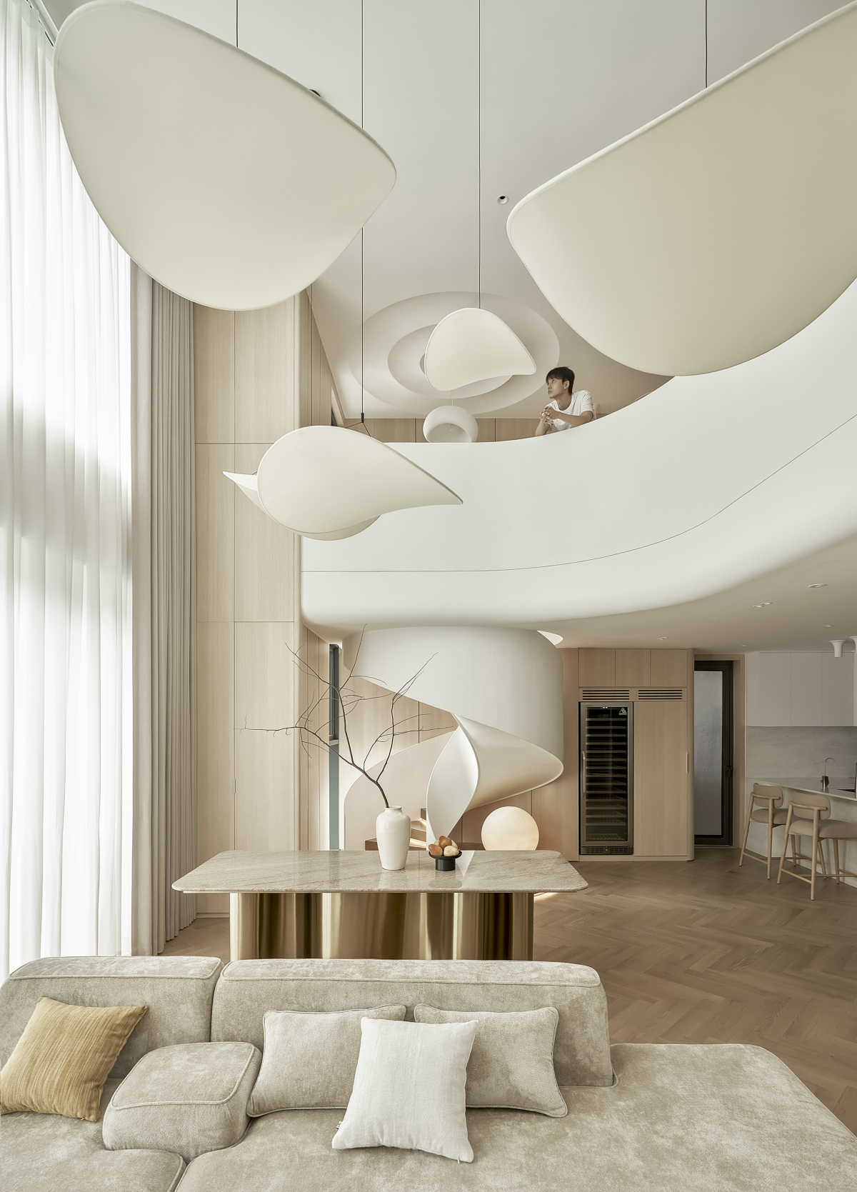 Khu vực thông tầng được bổ sung hệ đèn thả trần, cùng đường nét uốn cong mềm mại giúp tạo điểm nhấn cho không gian.