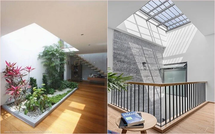 Trồng cây xanh xung quanh giếng trời sẽ giúp tạo điểm nhấn cho không gian và thanh lọc bầu không khí. Nên chọn loại cây ưa sáng, chịu hạn tốt và phù hợp với diện tích của giếng trời.
