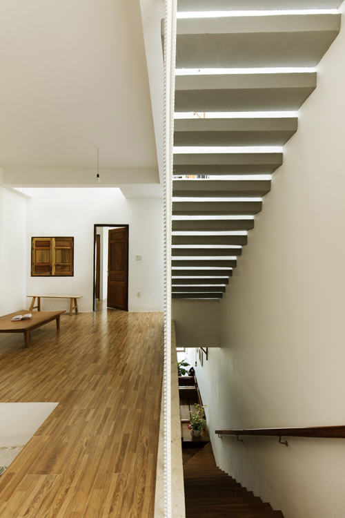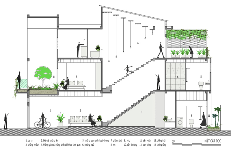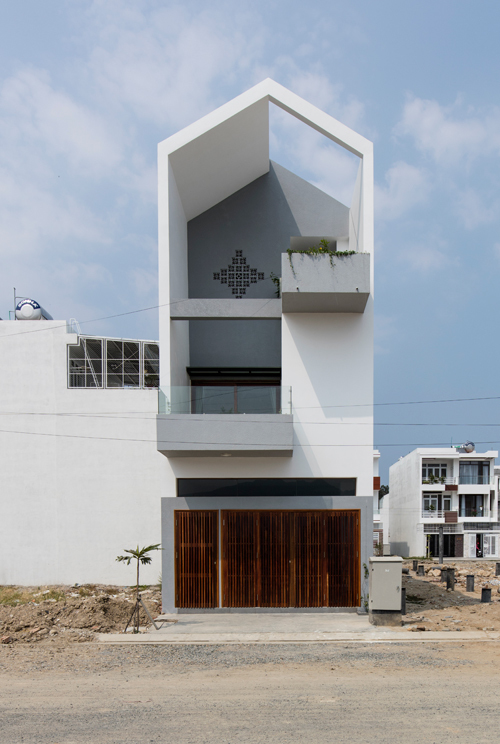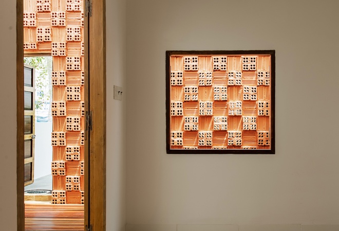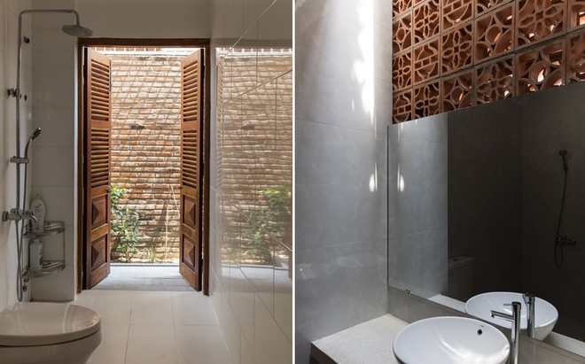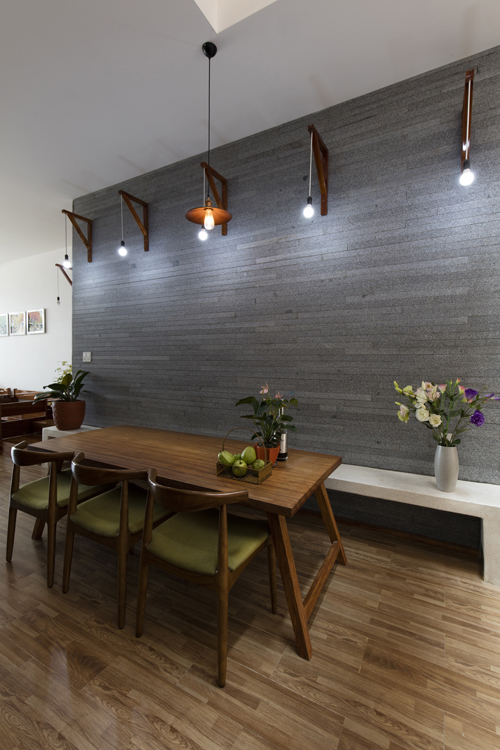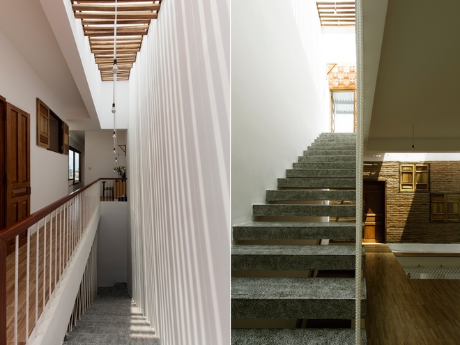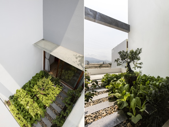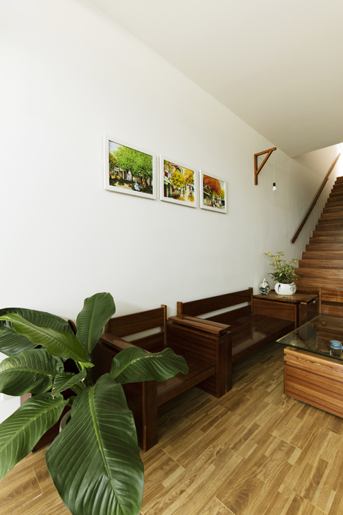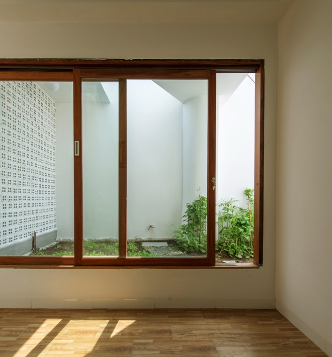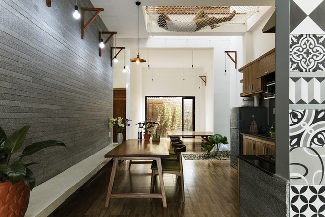 Ngôi nhà phố này nổi bật với vẻ đẹp giản dị nhưng đầy cuốn hút, mang lại cảm giác gần gũi và thoải mái. Tường gạch mộc ánh sáng vàng ấm áp, tạo nên sự mạnh mẽ nhưng không kém phần mềm mại. Những khóm cây xanh mướt và vườn rau